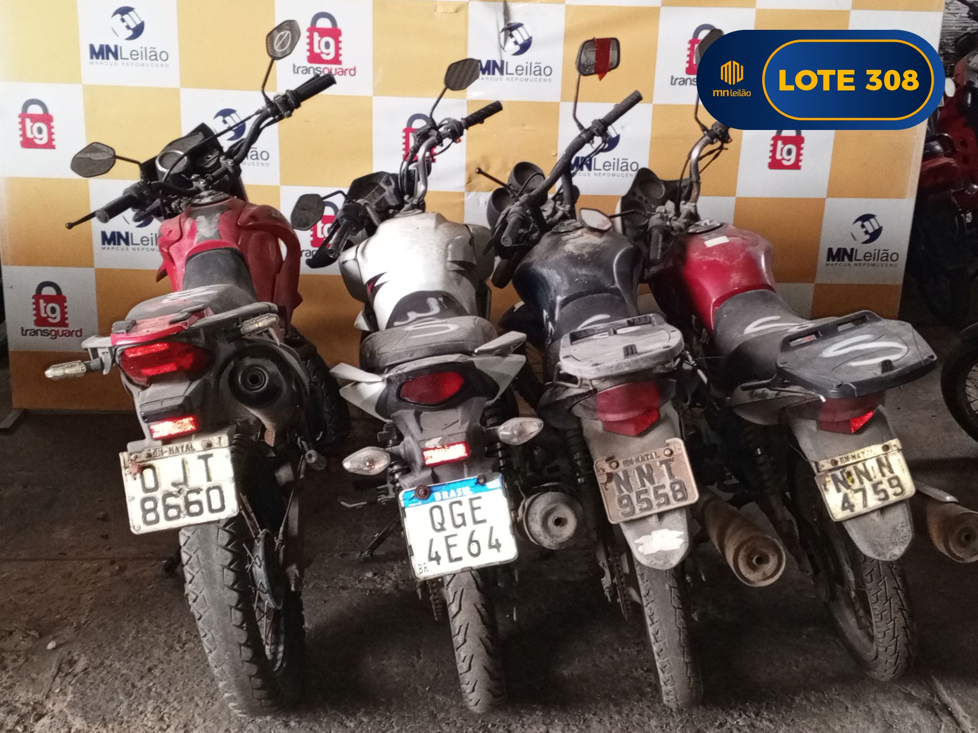SUCATAS - HONDA/NXR150 BROS ES, PLACA: OJT8660-RN, 2012; - HONDA/CG 160 TITAN EX, PLACA: QGE4E64-RN, 2016; - HONDA/CG 150 FAN ESI, PLACA: NNT9558-RN, 2010; - HONDA/CG150 TITAN MIX ES, PLACA: NNN4759-RN, 2009.